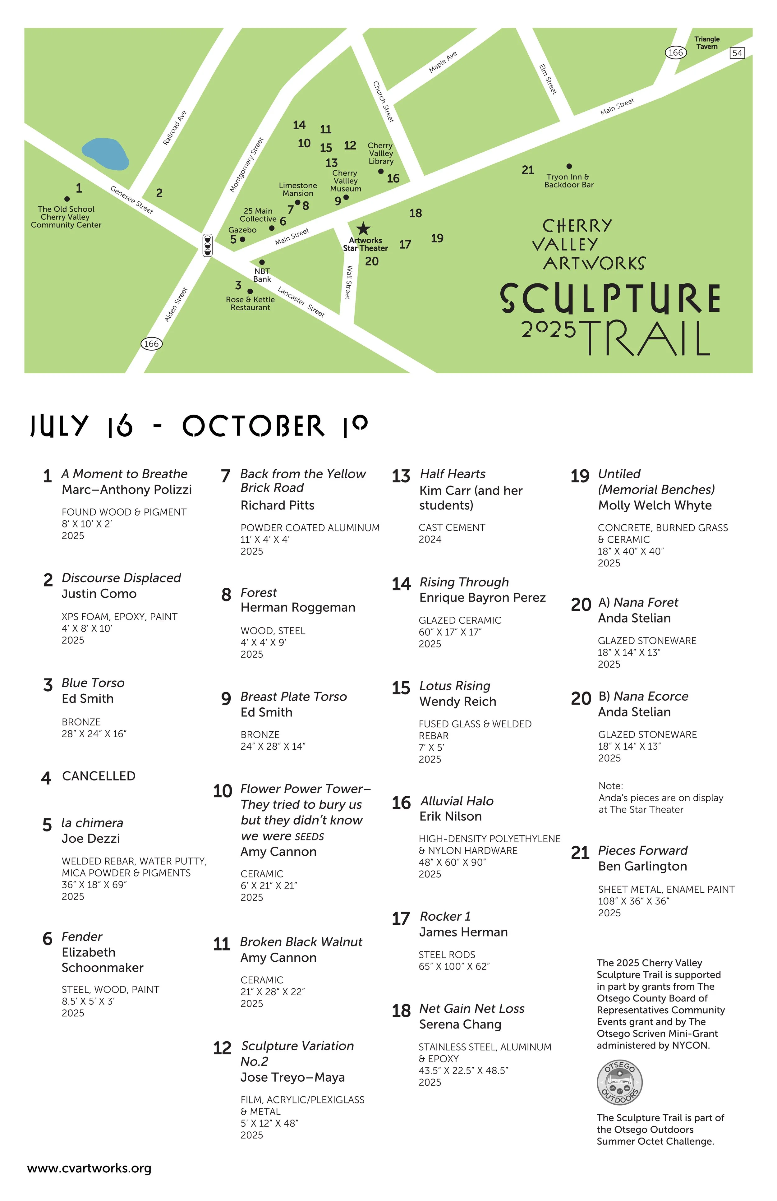 The 2025 Cherry Valley Sculpture Trail includes twenty-one sculptures installed at multiple locations throughout the town of Cherry Valley New York.